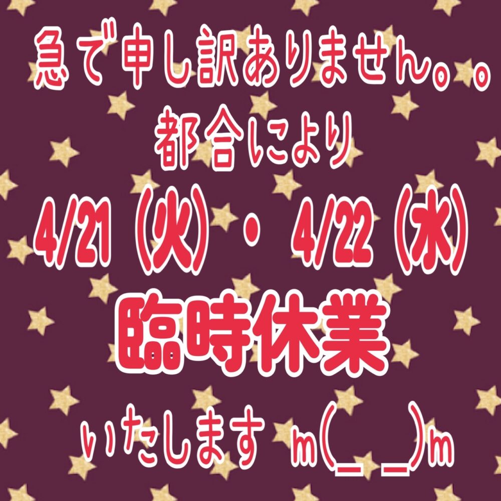 21(火)22(水)臨時休業いただきます(。>人<。)
